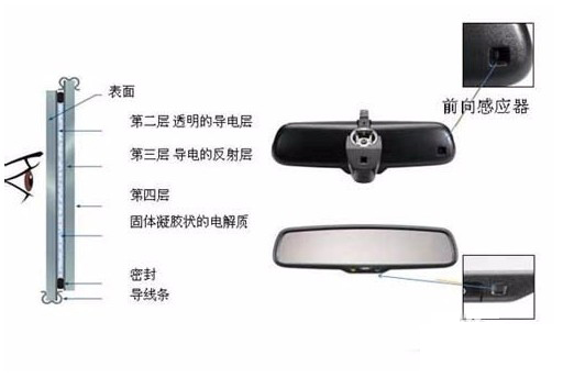 汽车后视镜由一面特殊镜子(电致变色材料)和二个光敏二极管及电子控制器组成。当后面灯光大于前面灯光,这时电子控制器将输出一个电压到导电层上。导电层上的这个电压改变电液颜色,电压越高,电液颜色越深,此时即使再强照射光照到后视镜上,经车内防眩后视镜反射到驾驶员眼睛上的都是暗光,但不耀眼。