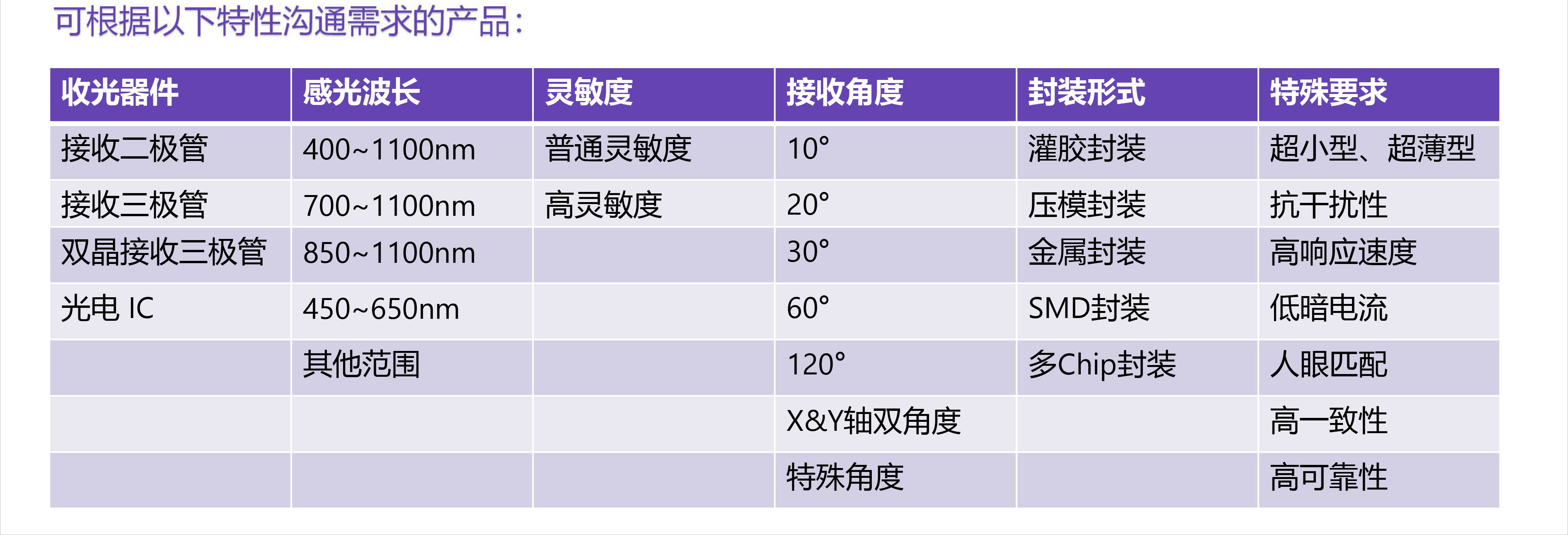 可综合考虑感光波长、感光灵敏度、响应频率、接收角度、封装形式、特殊要求等因素,结合产品的性价比,选择合适的产品。