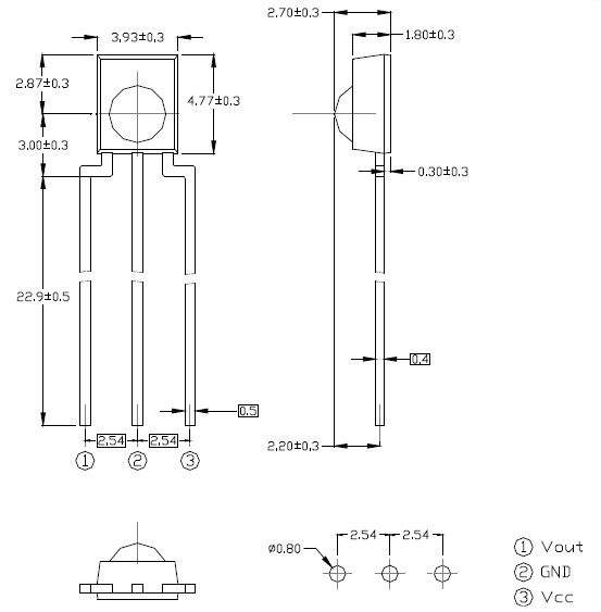●接收头IRM-6638T外型尺寸极小,只有4.77*3.93*2.7mm,是同类型插件接收头中最小尺寸的规格,可适应与空间更小的产品设计与使用,其余特性如下: