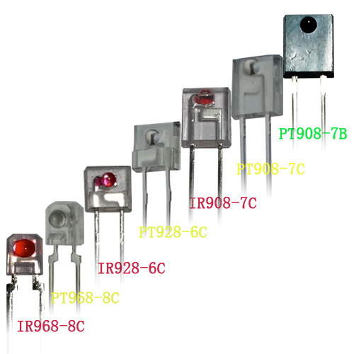 发光素子、侧向红外发射管、红外线发射管、发射管IR908-7C,IR908-7C-F,IR908-7C,IR908-7C-F,IR958-8C,IR968-8C;其中的C表示其透镜Lens为“水清色”透明体;而IR908-P,IR908-7P-F,IR928-6P,IR928-6P-F的“P”表示透镜为“粉红色”透明体,目前较少客人采用(早期客人采用,是为了区分接收管而选,如今发射管的红心Lens可以接收管明显区分,故原来在接收管Lens背面划黑色线来做区分的制程也已取消)