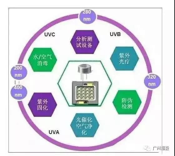 UVB和UVC主要应用于杀菌,消毒和医疗光照疗法等。此外,UVled从纸钞识别,应用到光树脂硬化,捕虫,印刷,并朝杀菌,消毒市场发展生物医疗,防伪鉴定,空气净化,数据储存及军事航空领域,以特种照明为主。