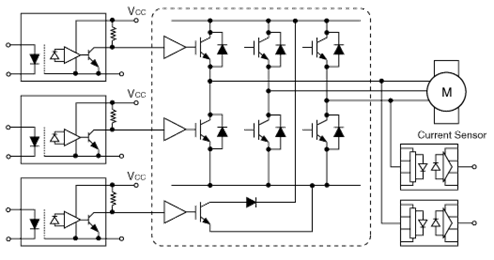 5.高速光耦应用于电机控制中,用作电流隔离电机线和控制集成电路,电机驱动控制的高速开关,比如IPM驱动/变频驱动: