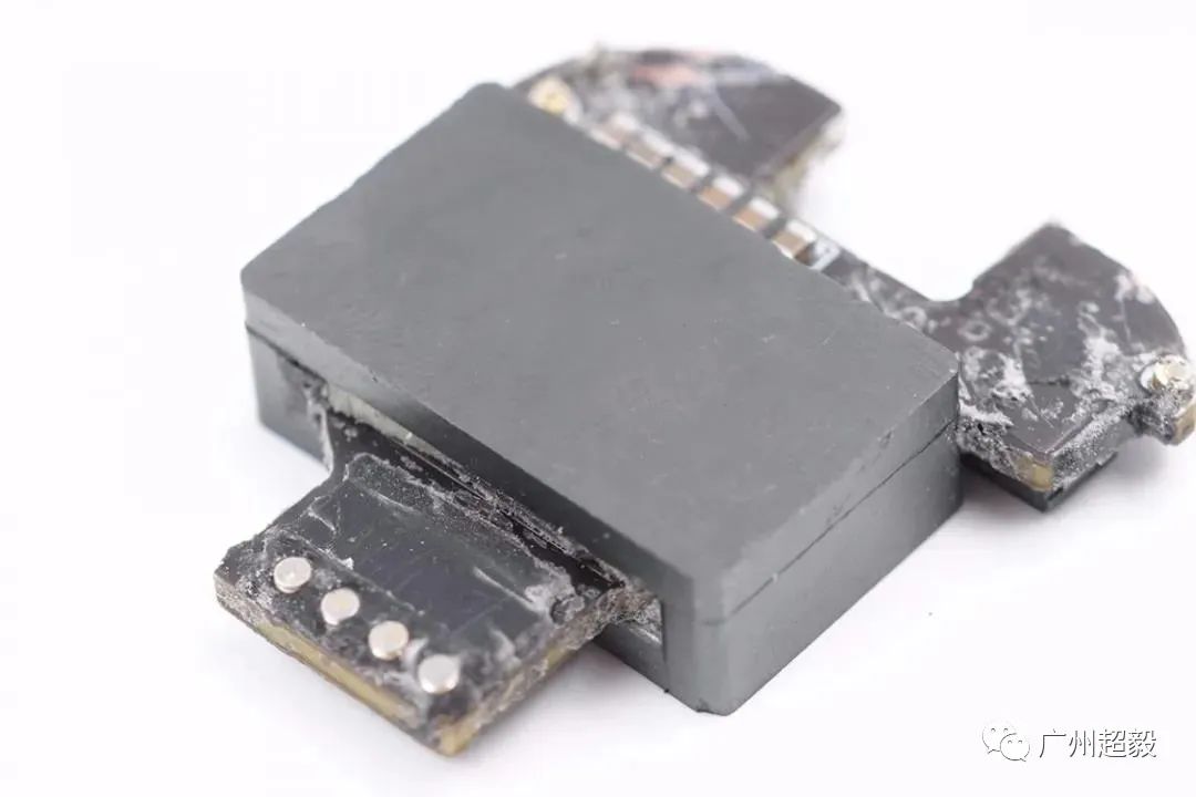 清理掉一部分黑胶,可以看到平面变压器的磁芯,磁芯和电路板之间有白色塑料架支撑绝缘。将剩余硅胶也清理掉,取下变压器两侧的绝缘支撑架。