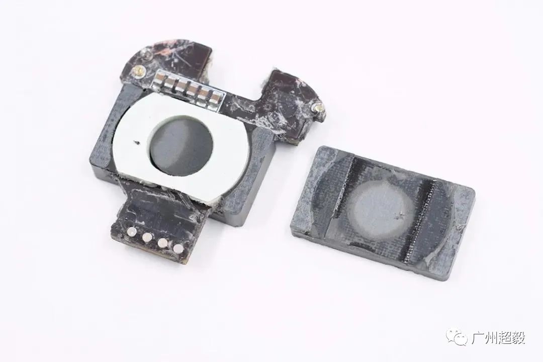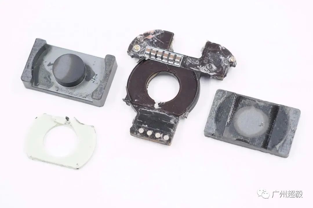 将磁芯拆开,内部有一块胶垫,中间圆形磁芯。