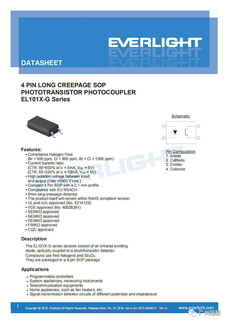 EL101X-G系列光耦器件由红外发射二极管组成,光学耦合到光电晶体管探测器上。部分规格书如下: