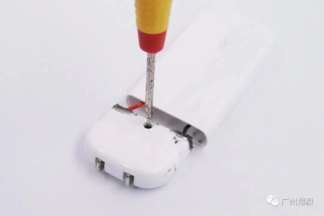 沿接缝处打开充电器,插头部分单独为一个壳体。拧开插头折叠壳体的固定螺丝。