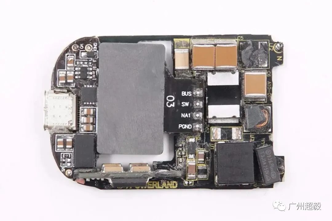 正面输入侧是多颗2220封装的高压MLCC滤波,由于对体积的极致追求,这款充电器内部没有采用传统的圆柱形高压电解电容来滤波,并且内置钳位二极管做初级侧过压保护,防止过压击穿电容和GaN开关管。