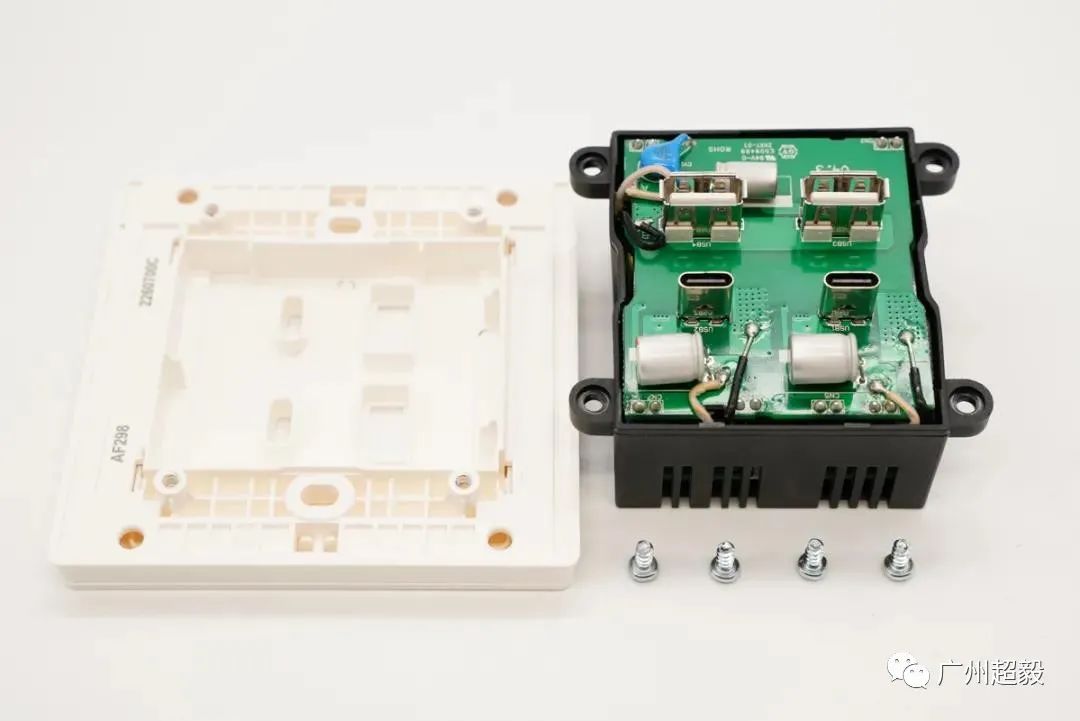 小编发现,ABB根据市场需求结合ABB品牌优势研发出了一款新式的四位输出USB充电插座产品外观延续了传统墙上插座的方正造型配备了2A2C四个USB接口仅需一根数据线即可充电十分方便。下面充电头网就对这款产品进行拆解看看其内部如何设计。