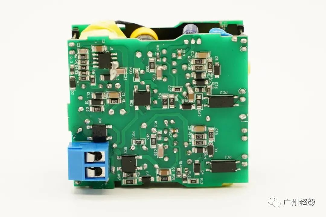通过拆解发现,ABB四位输出USB充电插座采用三路电路设计,可以说是三个充电器的集合体。并且两个USB-C电路设计完全相同,对称性十分明显。