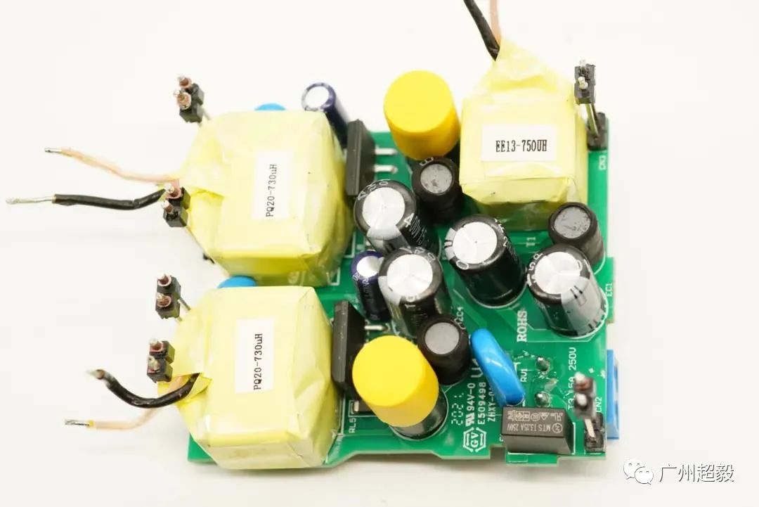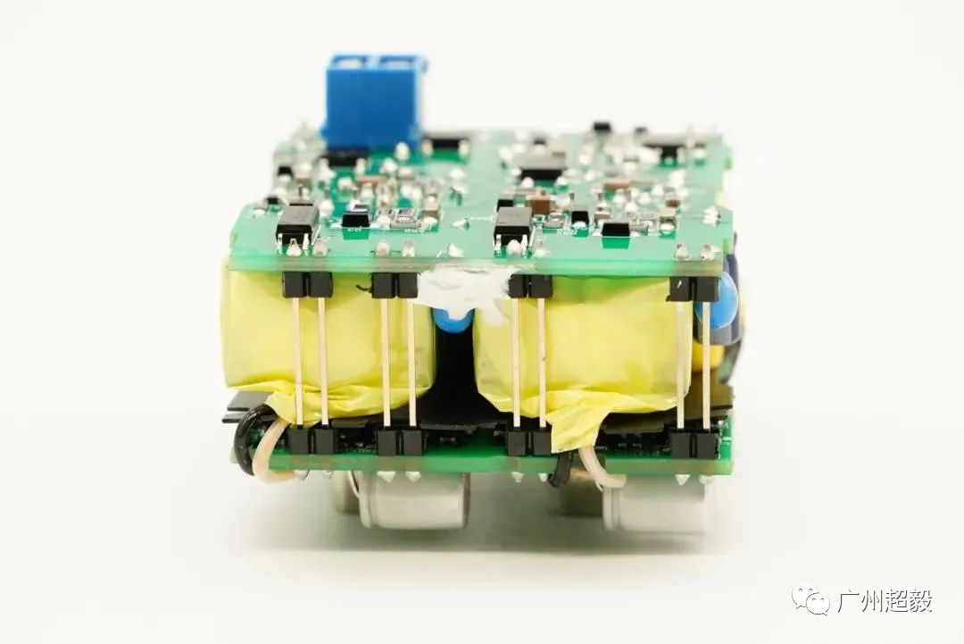 将两块板子分开,输入端元器件和输出端电路板之间有黑色绝缘板隔离。