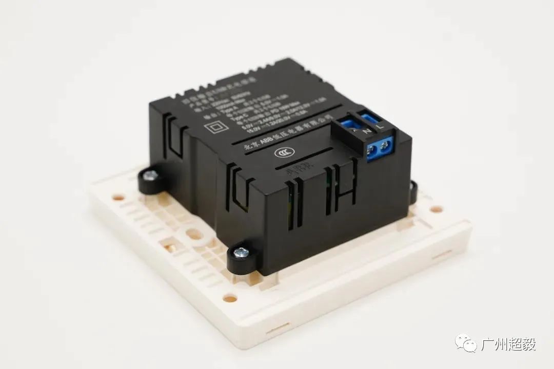机身外壳为黑色,使用螺丝连接固定在白色外壳上。黑色外壳周身设计有镂空槽,帮助散热,蓝色接线柱用来连接火线和零线,通过螺丝压紧固定。