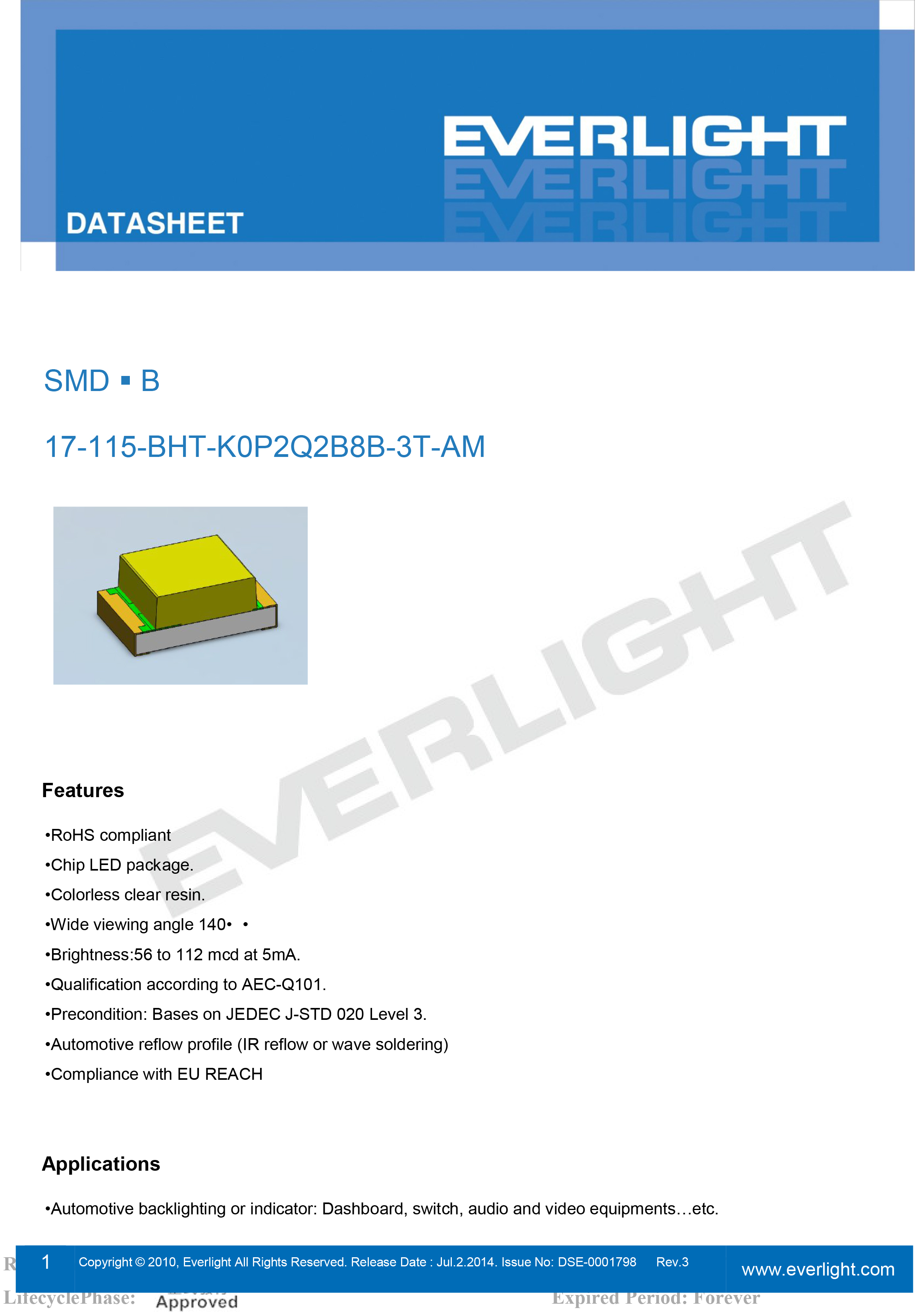 - 亮度: 56至112 mcd/5 ma。根据 aec-q101确定资格。前提条件: 基于 jedec j-std 020第3级。