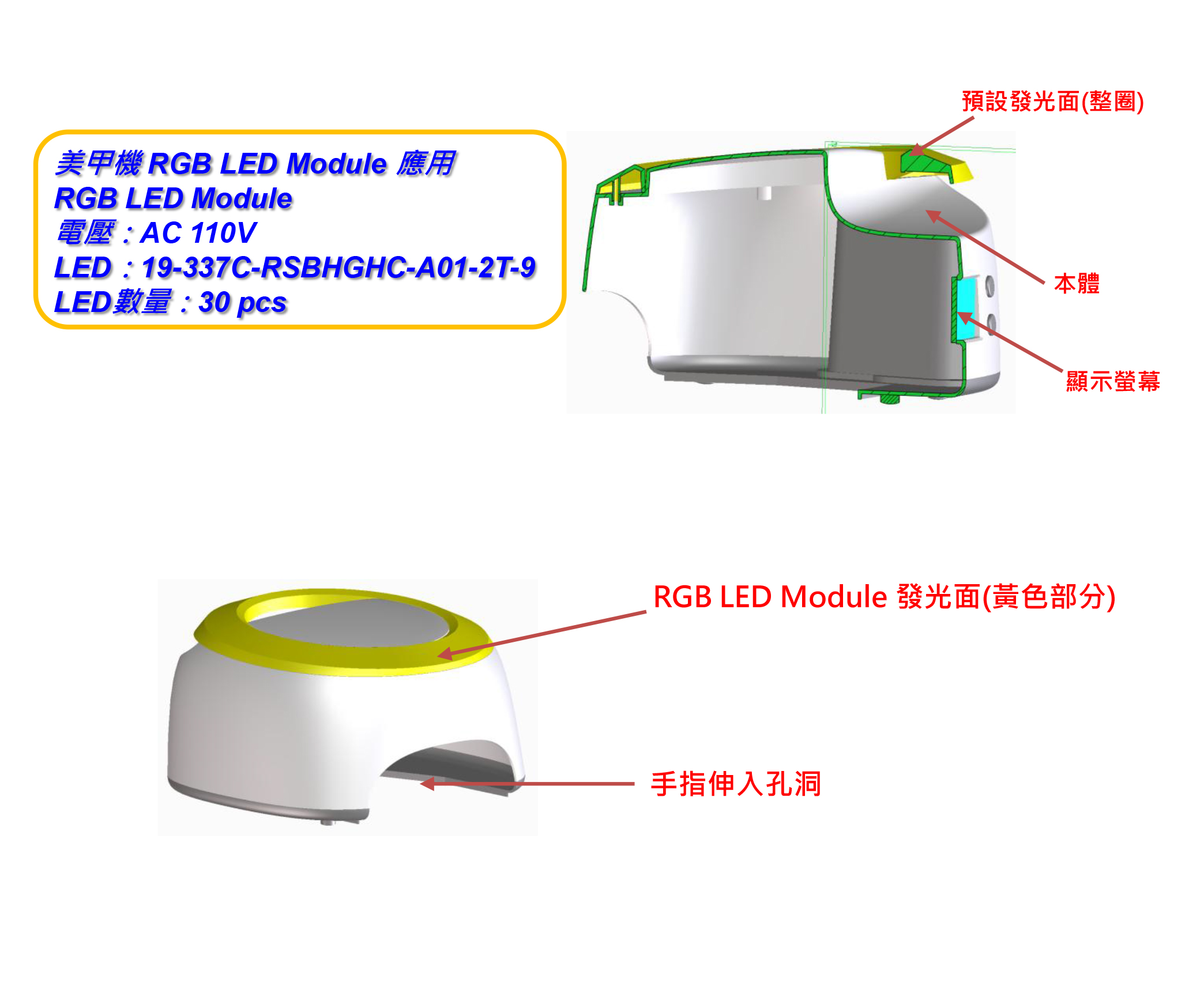 其中,美甲机可以使用亿光的UAV LED 19-337C-RSBHGHC-A01-2T-9系列灯珠,led技术正日新月异的在进步,它的发光效率正在取得惊人的突破,价格也在不断的降低,亿光生产的LED灯珠具有节能、长寿命、环保等优点。
