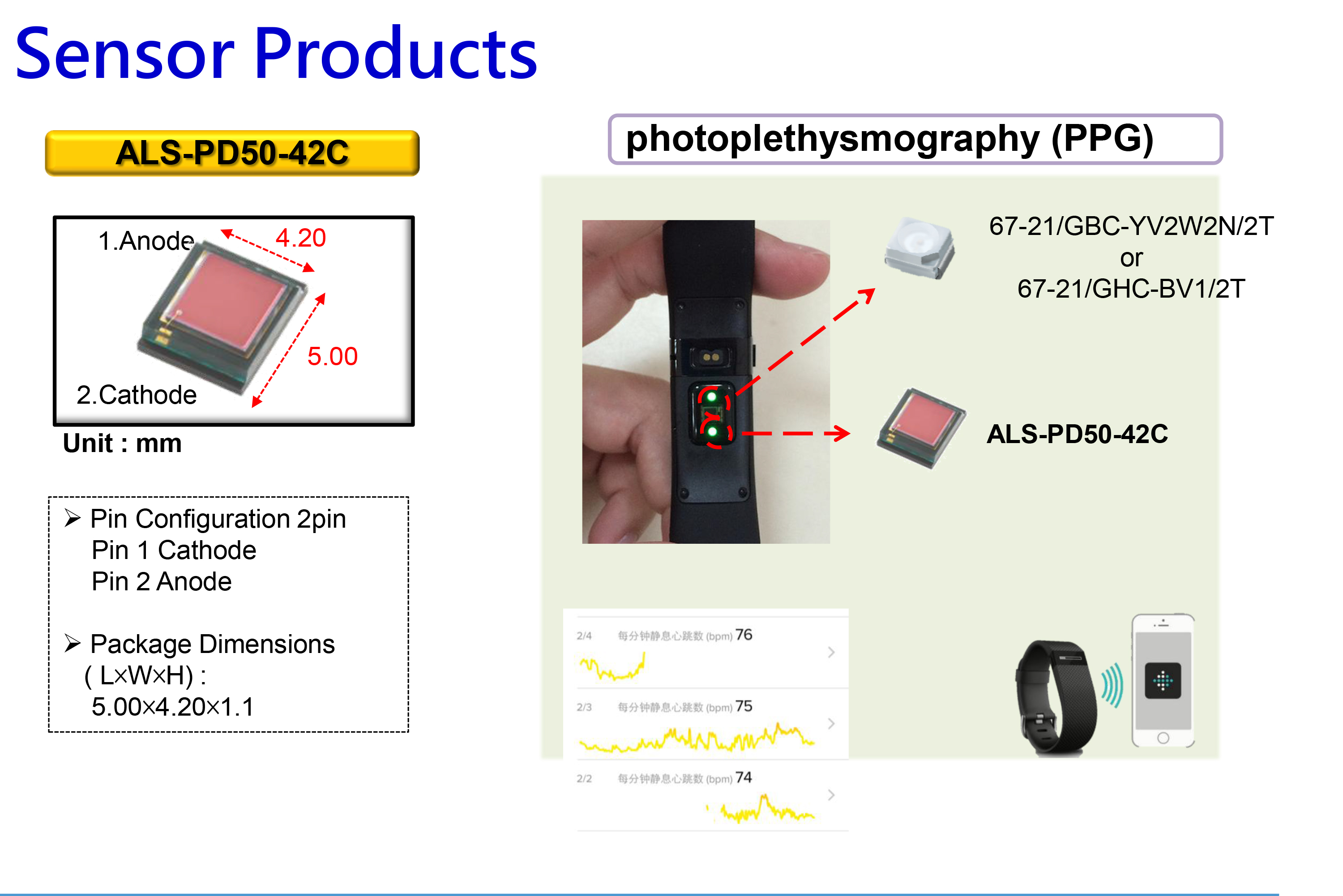 亿光ALS-PD50-42C系列环境光传感器,采大感光区域面积设计,采感测绿光的550nm波段,主要考虑受检者皮肤接触容易受到肤色、刺青或毛发等干扰,增加感测面积可增加辨识能力,便于侦测心率讯号,特别适合运动手表等穿戴式应用。