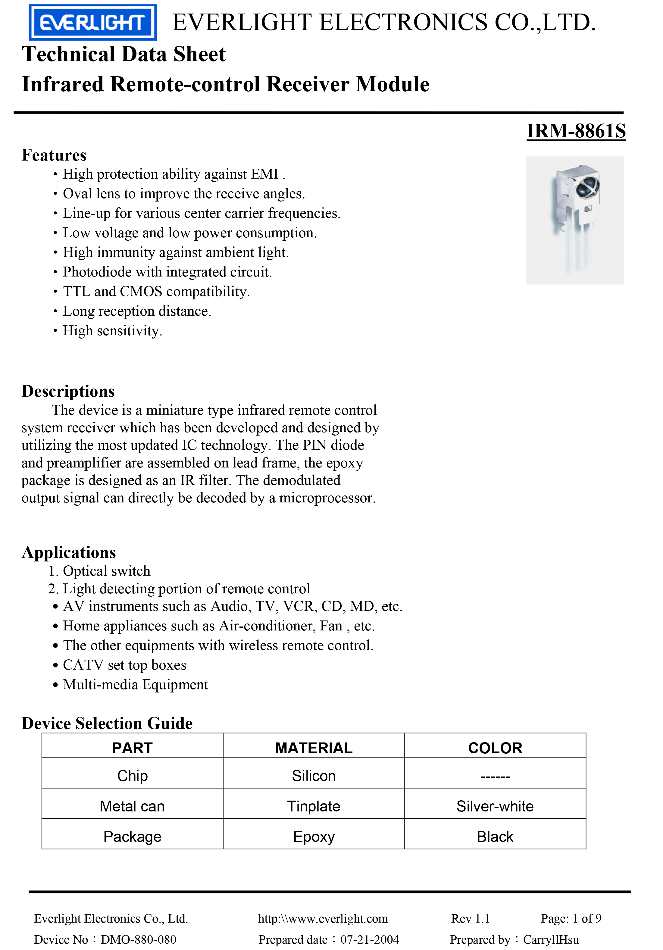 亿光IRM-8861S系列红外线接收头是利用最新的集成电路技术开发设计的微型红外遥控系统接收器,其PIN二极管和前置放大器组装在引线框架上,用环氧树脂来封装好,然后设计成红外滤光片。解调后的输出信号可由微处理器直接解码。