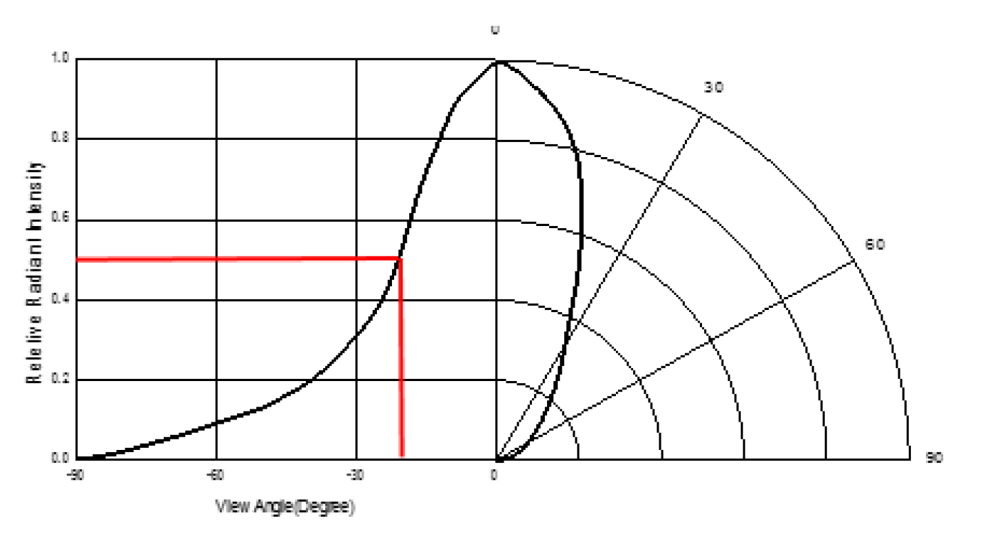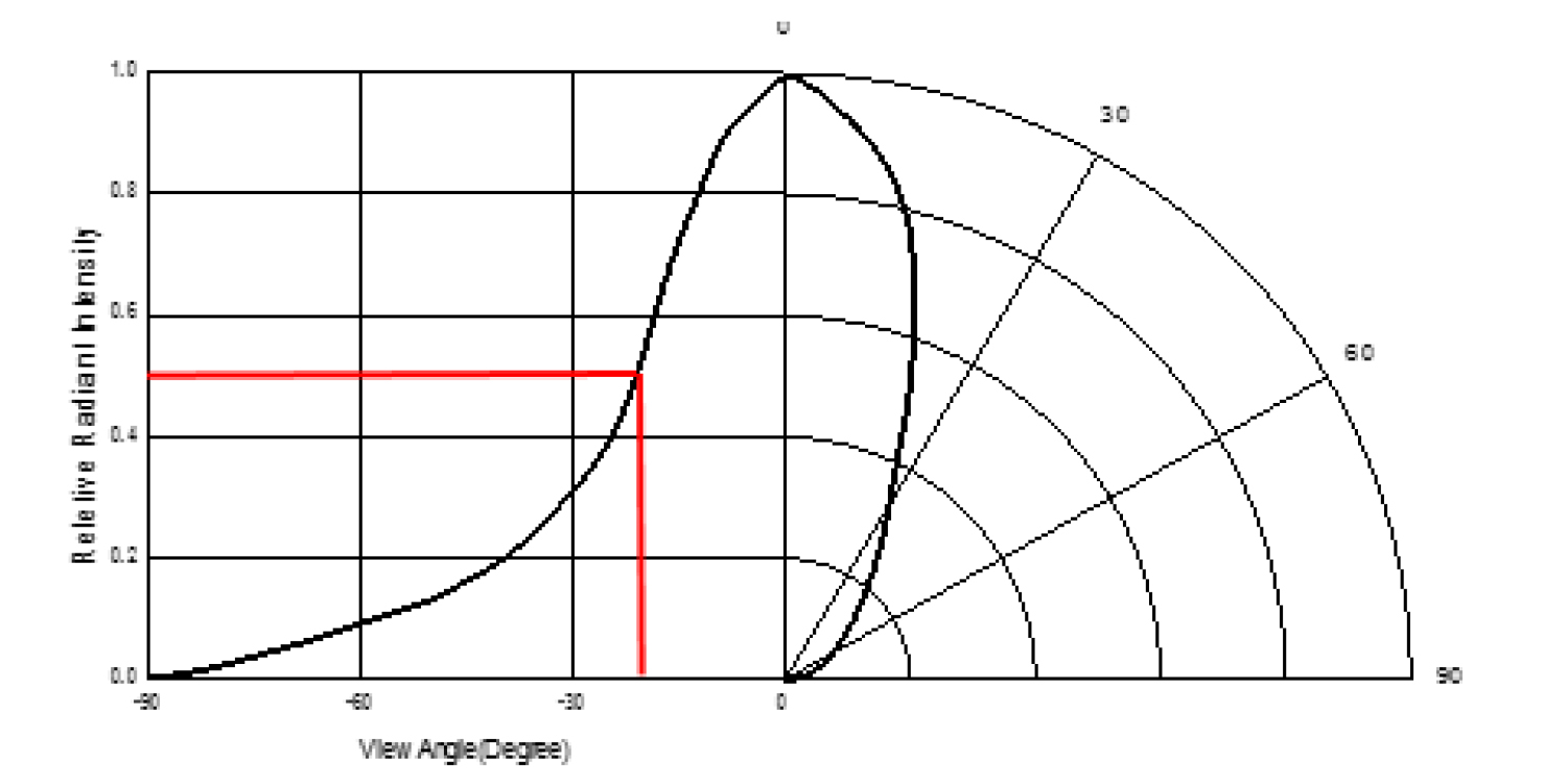 红外发光二极管规范规定了在固定电流下0度角的辐射强度。它的值会随着角度的变化而衰减。视角是强度衰减到1/2的角度。有关定义,请参阅下图中的红色区域。
