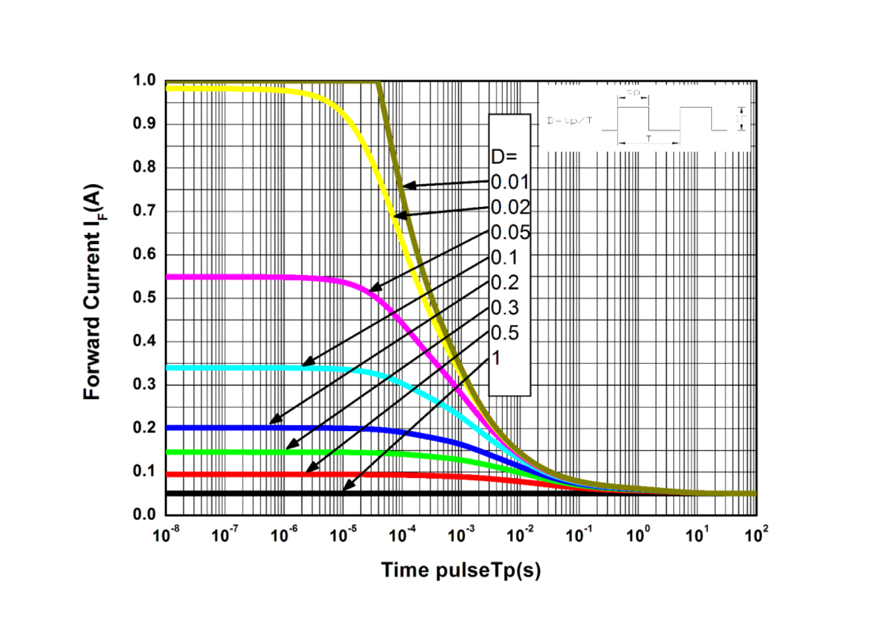 IR规格将指示最大连续输出电流(连续正向电流),该值通常在环境温度TA=25℃时定义。如果需要在不同的环境温度下工作,则需要参考规范下图1中的最大直流正向电流与环境温度之间的关系。此外,如果在以最大连续输出电流发射时接收距离需要大于接收距离,可以参考最大正向电流和占空比之间的关系图(该图在不同环境温度下具有不同的曲线)来增加发射电流。以下图2为例,在连续发射的情况下,最大工作电流为50mA。占空比为50%时最大工作电流为100mA,占空比为30%时最大工作电流为150mA。