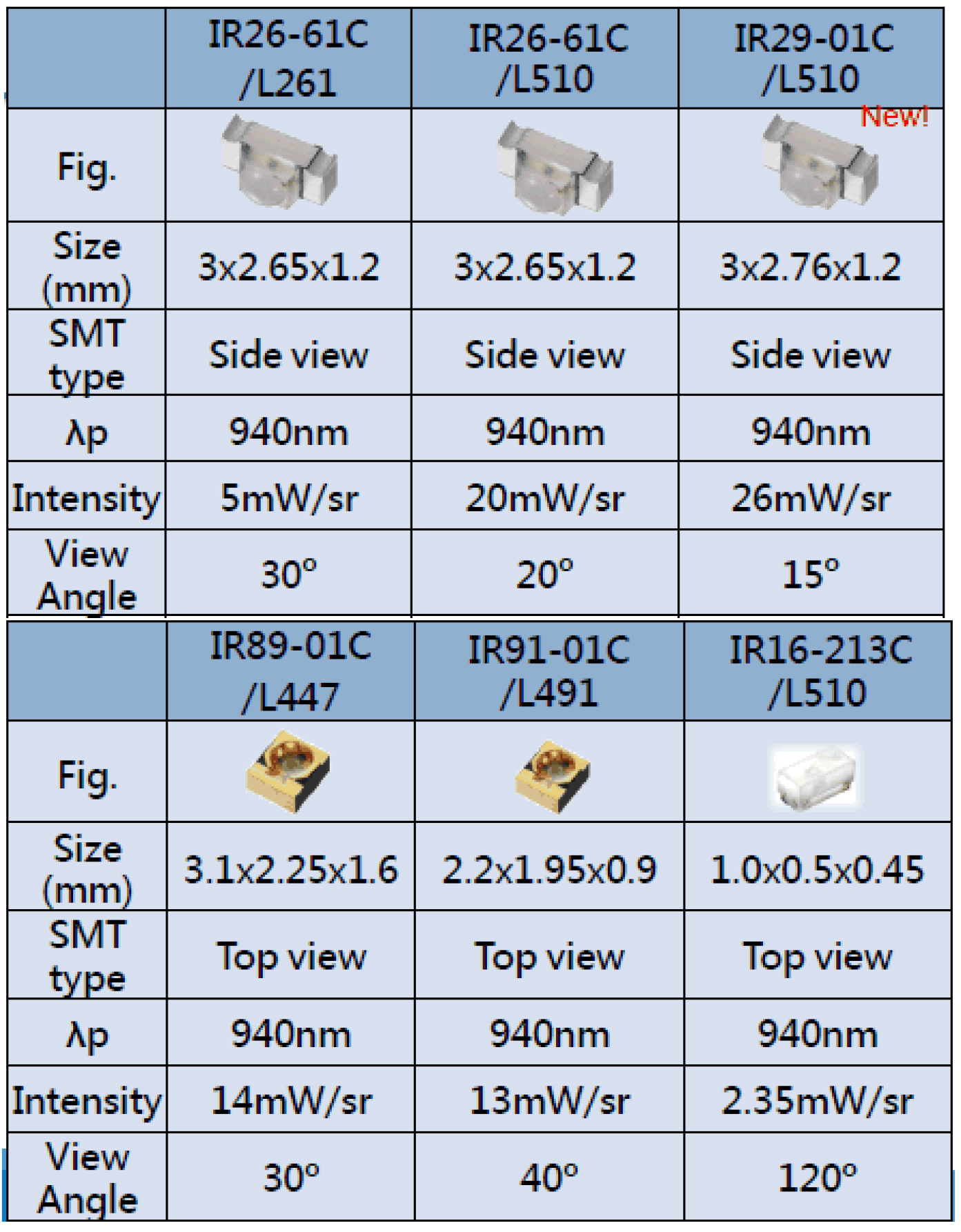 下面表格是推荐亿光的SMD IR型号和简单规格。
