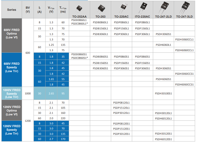 强茂超快恢复二极管(FRED),PSDD0860S1、PSDP08120S1等型号,具有极短的恢复时间和低的反向恢复电荷。它的快速恢复时间、低开关损失、高热稳定性和低反向漏电流等特性,使得FRED成为电源控制和高速开关领域的理想选择。
