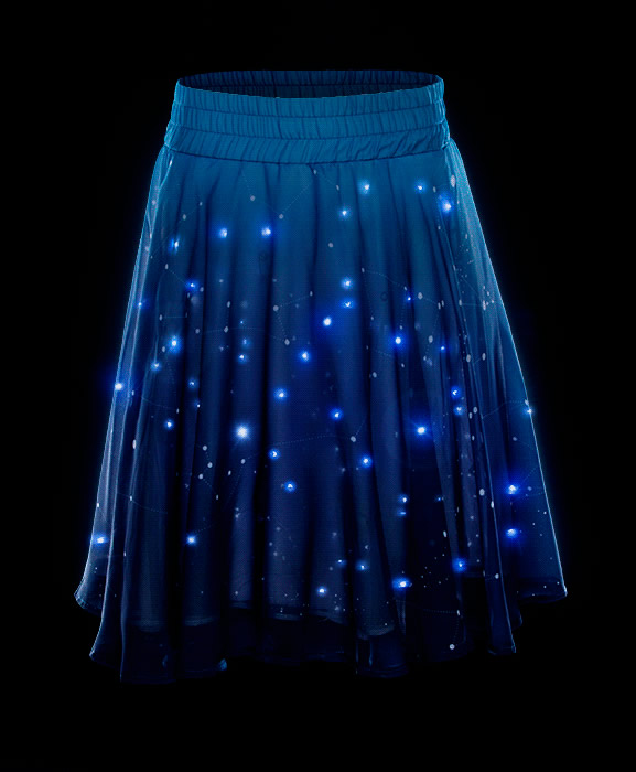 2016年,美国趣味电商ThinkGeek推出了一款闪亮的LED星星裙Twinkling Stars Skirt,结合了可穿戴式LED技术和精确的星座图,格外吸引眼球。 这款裙子由三层组成,包括白色内衬、一层白纱及透视的“星座层”。