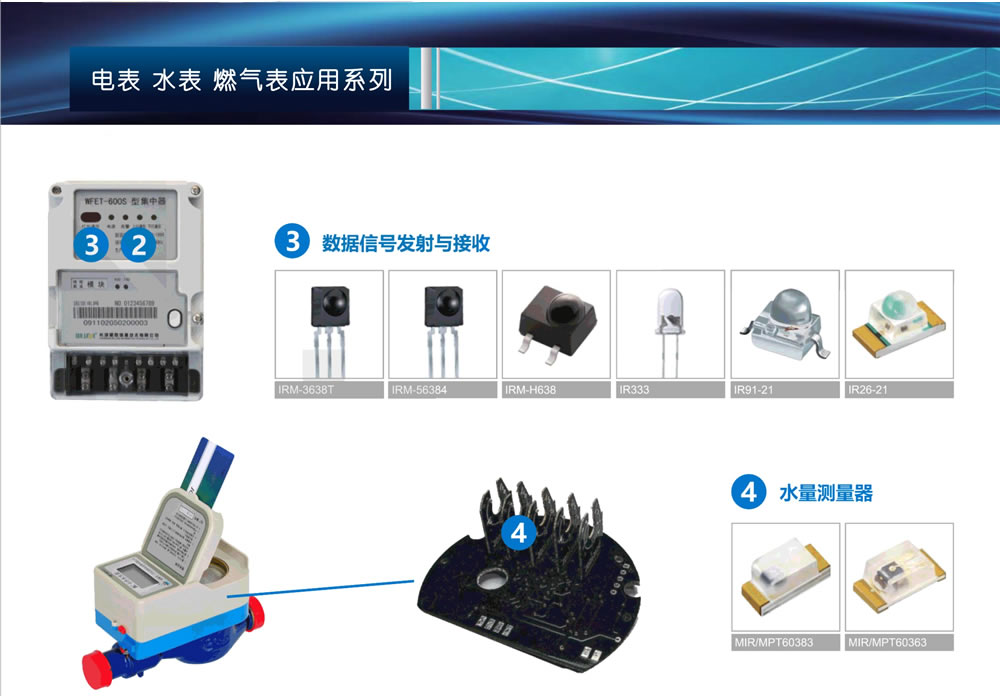 在数据信号发射与接收可用到IRM56384、IRM3638T、IRMH638等接收头,IR333/IR91-21/IR26-21等发射管,水量测量器上可用到MIR/MPT60383以及MIR/MPT60363。