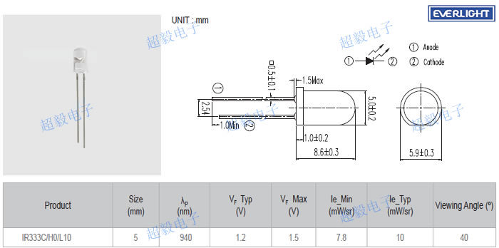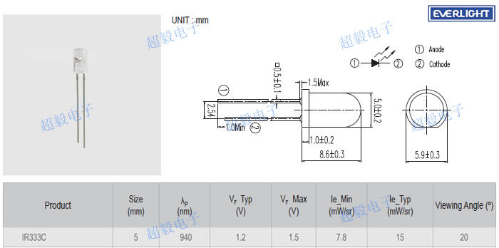 亿光电子红外线发射管IR333C-H0-L10的尺寸符合蓝牙读卡器外观精巧的要求了,5MM直插的发射管,脚长可以根据要求剪脚。关键的是,亿光电子IR333C的电压-VF最大能达到1.5V,波长为940nm。在蓝牙读卡器中能够达到读卡器的电流电压要求。下面是IR33C-H0-L10的参数详细介绍: