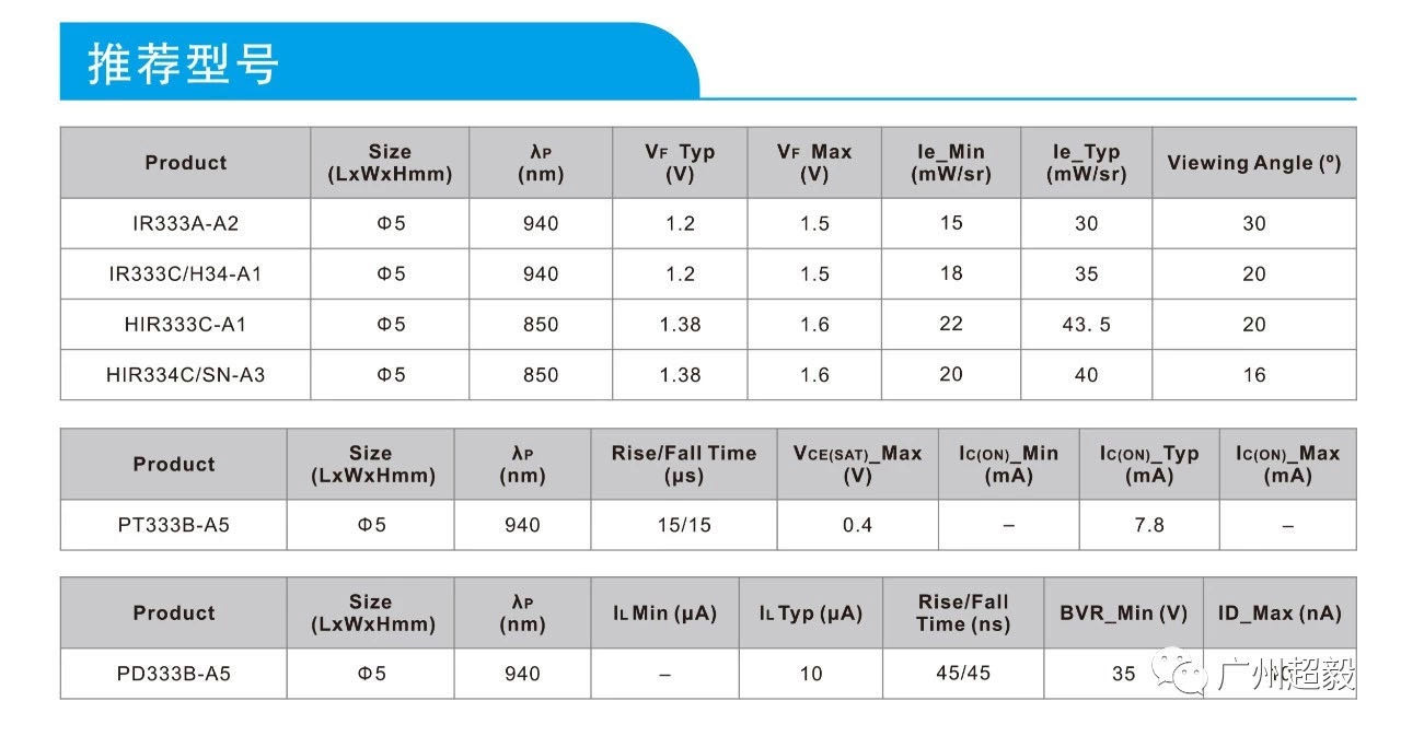 EVERLIGHT品牌红外发射管、红外线发射管、发射管、红外发射二极管、发射二极管,分为插件发射管,贴片发射管;小功率发射管、大功率发射管,主要有850nm,875nm,940nm三个峰值波长系列。