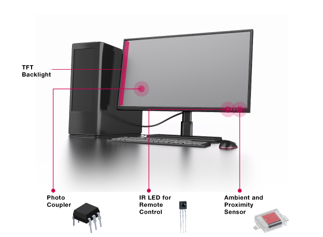 亿光的LED提供TFT LCD Monitor 应用产品最佳的背光解决方案,提供薄型化、低功耗与超亮度的LED的LED 得以让Monitor 呈现真实及专业性的显示效果。红外线部份,亿光的 IRM (红外线遥控模块) 及 ALS (环境光感组件)可以被简单的使用在红外线遥控与屏幕背光自动调整等应用,而Photo Coupler 也常被用于显示器的电源控制应用。