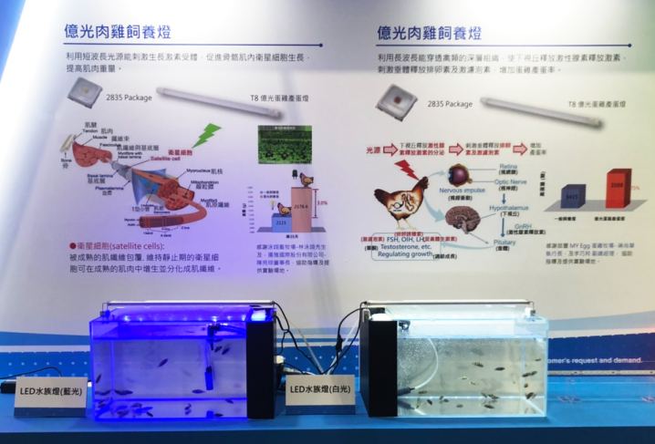 过去为了提高育成率,必须以人工的方式用筛网将石斑鱼苗分成数种鱼体大小,分筛至3~5池不等,此作业需每二至三日重复进行,频繁的分池、分筛过程不仅消耗人力;筛选过程亦使只苗体表受损,造成鱼只极大的紧迫,加剧石斑鱼病毒爆发的机会。对于这种情况,亿光与台湾大学渔业科学研究所王松教授团队合作,成功开发出了一款专用于石斑鱼的LED灯具,并提供石斑鱼养殖者进行试验,在专用LED灯具照射下,石斑鱼残食的情况大幅度降低,使鱼苗损失降低四成以上,成功使养殖石斑鱼苗存活率翻倍。