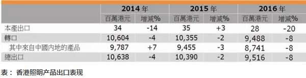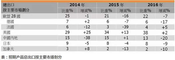 2016年,香港照明产品总出口按年下跌8%。虽然香港对美国的照明产品出口表现稳定,但对欧盟和中国内地等其他市场出口却见失色。