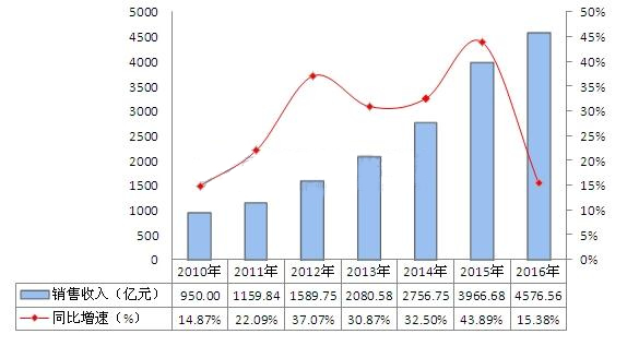 需求方面,2010-2016年,中国LED行业销售收入呈逐年增长趋势,其中2016年实现销售收入4576.56亿元,同比增长15.38%。