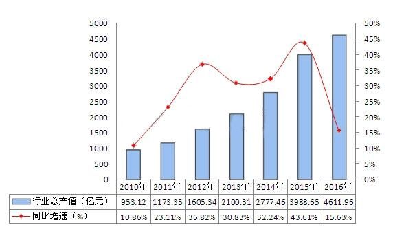 LED企业整体经营效益向好,源于LED产业产销规模的稳定增长。数据显示,2010-2016年,中国LED行业工业总产值呈逐年快速增长趋势,2016年实现工业总产值4611.96亿元,同比增长15.63%。